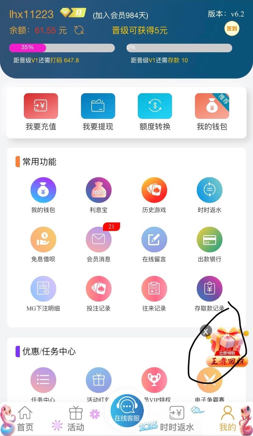 老用户有号且充值过的登录领取老用户回归彩金 有的人接到了电话 去试试看碰碰运气