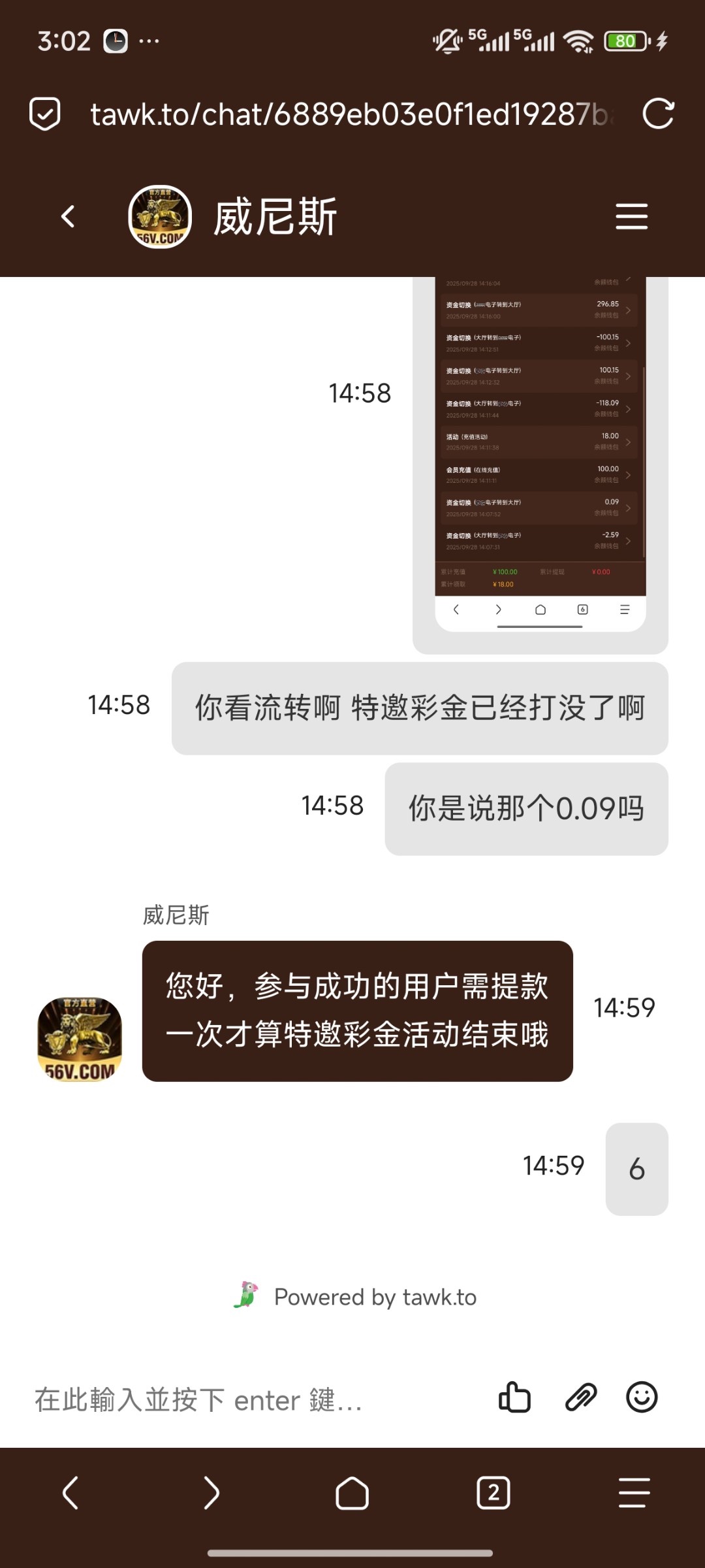 我参加特邀领了88彩金打死了 想着上100参加那个首存送18的活动 打到800不给提 跟我说特邀彩金最高只能提200 跟我解释说必须提款一次这个特邀活动才算结束 真的纯纯傻逼 不要充值了 估计是半黑的