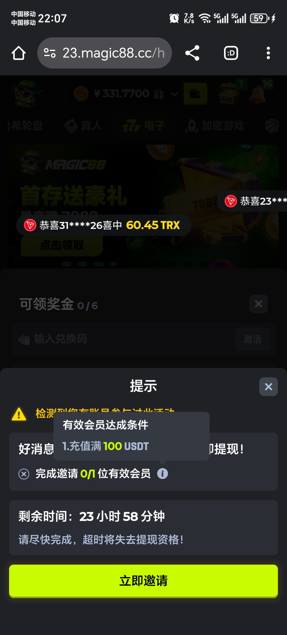注册就送20u,秒送的,自己领就行,不用找客服啥的,完成5水提5u好像,没注意看,提现自己测试。别充,白嫖即可,飞机搜 @magic88023_bot