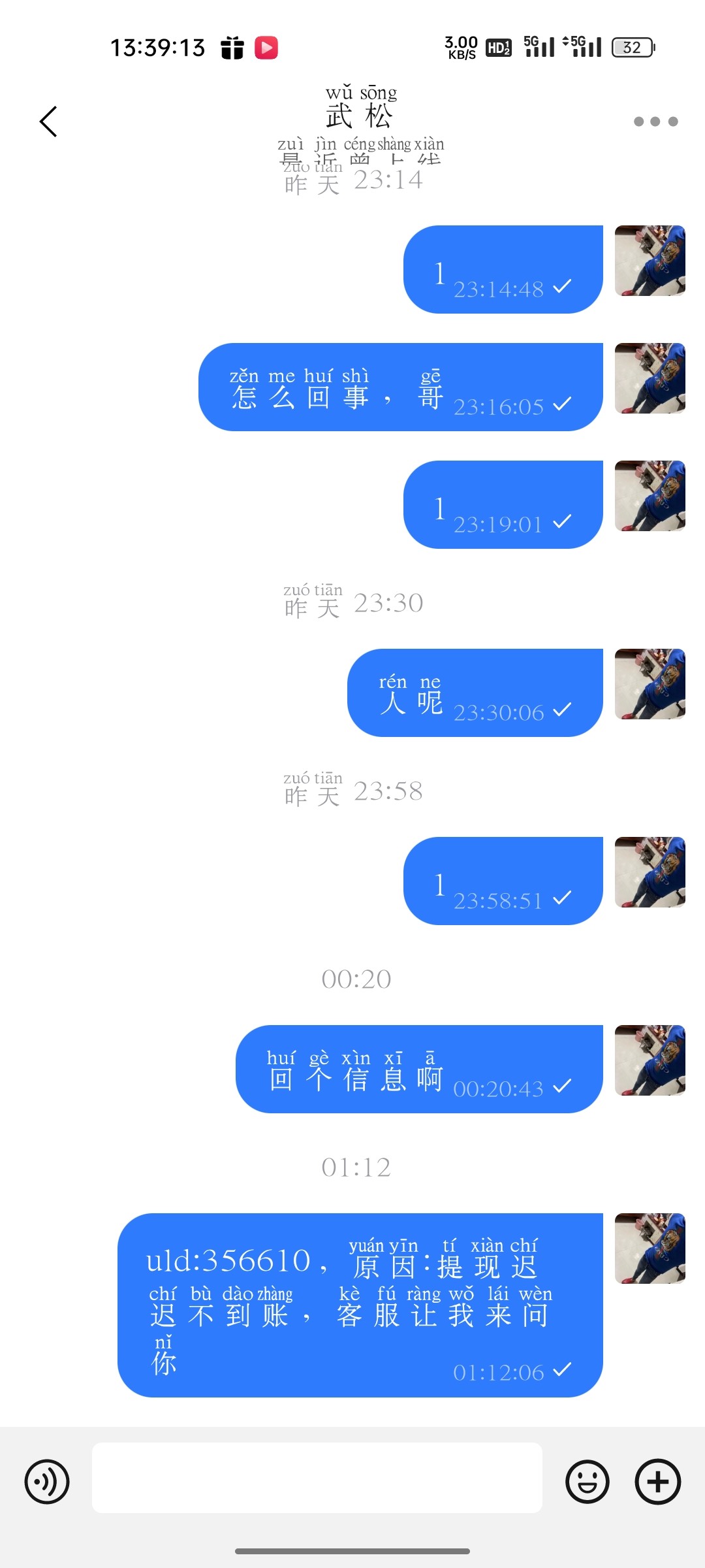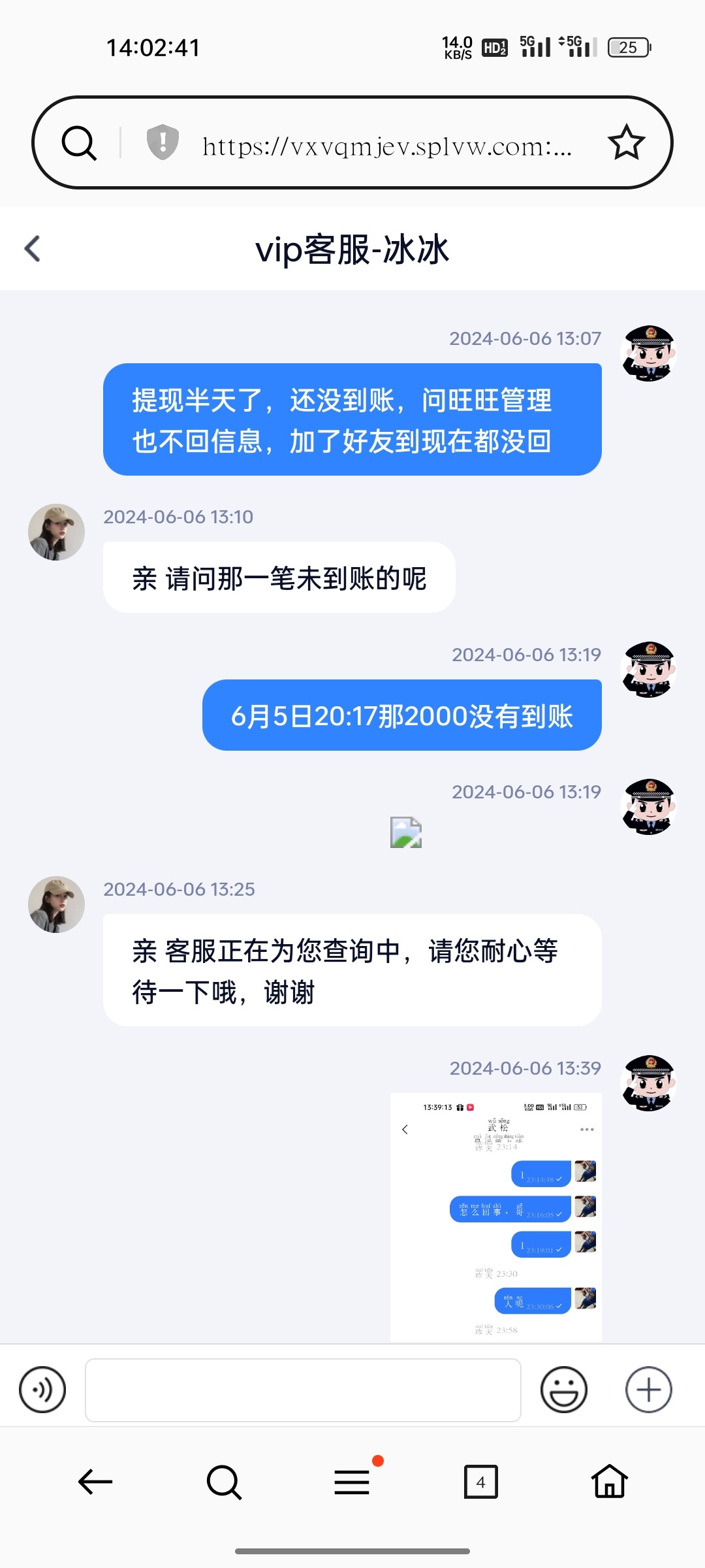 提现2000,昨晚提到现在都没到账,问客服都是说联系管理,那sb管理半天都不回信息,昨晚加到现在都没回过,我也在想2000也没必要黑了,可他就是不给出,老哥们,避雷亿万,充值29000了,连2000都不给提现