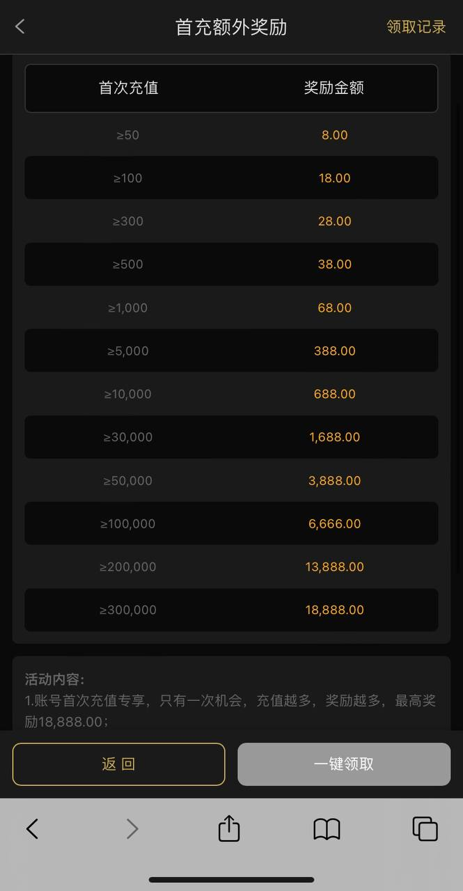 首存活动下载APP:50+8/100+18/300+28/500+38/1000+68